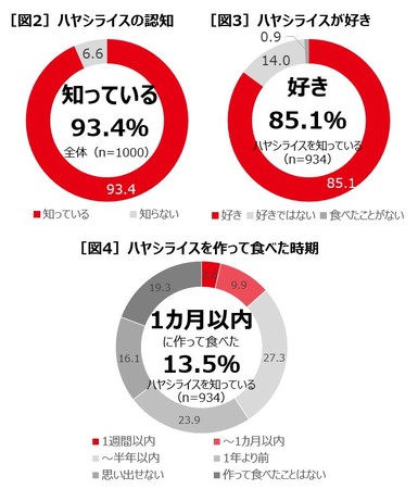 自宅で食事を楽しむ機会は増えていますが、ハヤシライスは食べられているのでしょうか? ハヤシライスを「知っている」と答えたのは93.4%と、もちろんほぼ全員がハヤシライスを認知しています[図2]。また、ハヤシライスが好きかと聞くと、85.1%が「好き」と答えました[図3]。