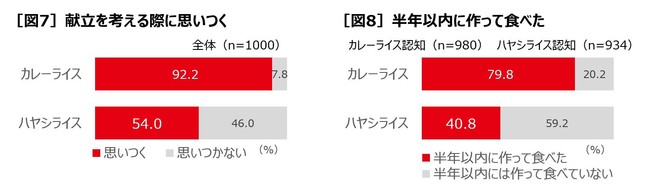 ハヤシライスの存在感が薄い背景には、国民食カレーライスの影響が大きいようです。献立を考える際、カレーライスを思いつくかと聞くと、92.2%が「思いつく」と答えた一方、ハヤシライスを思いつくと答えた人は54.0%に留まりました[図7]。また、半年以内に作って食べた人は、カレーライスは79.8%と約8割の一方、ハヤシライスは40.8%と半数以下でした[図8]。国民食であるカレーライスの存在があまりに強い一方、ハヤシライスは控えめなポジションになっているようです。