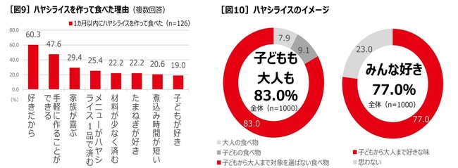 最近1カ月以内にハヤシライスを作った人に作った理由を聞くと、1位は「好きだから」(60.3%)、次いで「手軽に作ることができる」(47.6%)、そして「家族が喜ぶ」(29.4%)、「メニューがハヤシライス1品で済む」(25.4%)と続きます[図9]。手軽さやおいしさだけでなく、「好き」「喜ばれる」といった気持ちの上での満足度も高くなっています。全員にハヤシライスのイメージを聞くと、「子どもの食べ物」(9.1%)というイメージは低く、8割が「子どもから大人まで対象を選ばない食べ物」(83.0%)と答えています。さらに、ハヤシライスは子どもから大人まで好きな味だと思うかと聞くと、約8割が「子どもから大人まで好きな味」(77.0%)と答えました[図10]。