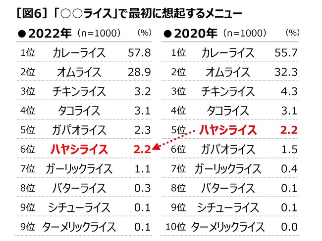 2020年の調査※でもハヤシライスの想起率は2.2%でしたが順位で見ると5位。今回は想起率は変わらないものの6位に後退し、「ガパオライス」(2.3%)よりも思いつかないメニューとなり、ハヤシライスの存在感のなさが露呈する結果となりました。