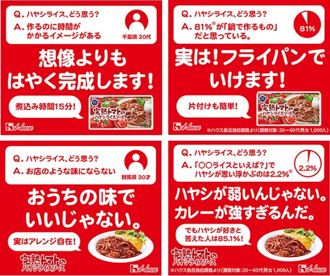 今回の調査結果で浮かび上がったハヤシライスに対する誤解を提示し、その誤解を解くメッセージで構成されたバナー広告を展開します。発信するメッセージは全部で4タイプ。思わずハヤシライスが食べたくなります。