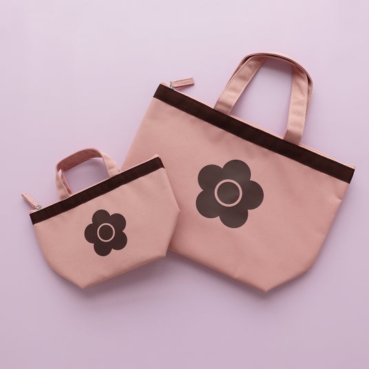 中央の“デイジー”がポイントのシンプルなデザイン。くすみピンクを使ったバイカラーで日々のコーディネートのアクセントにおすすめです。中にメッシュのポケットがついており、保冷剤やウェットティッシュなどを入れるのに便利です。