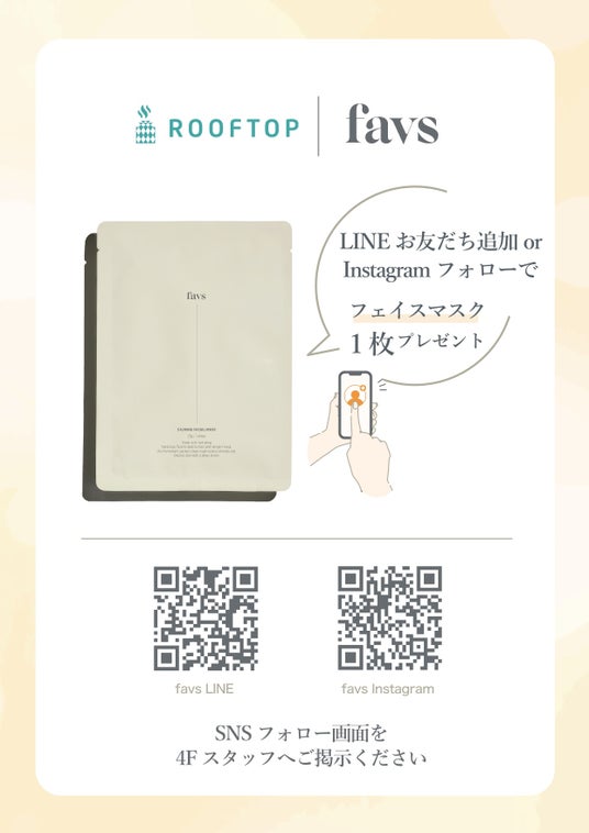 2024年7月13日(土)から7月31日(水)までの期間限定で≪ROOFTOP sauna≫にて開催いたします。SNSのフォロー画面ご掲示でfavsの大人気商品、≪CALMING FACIAL MASK ≫を1枚プレゼント!
