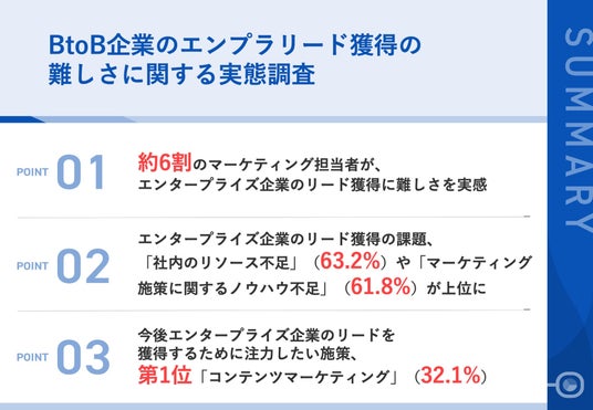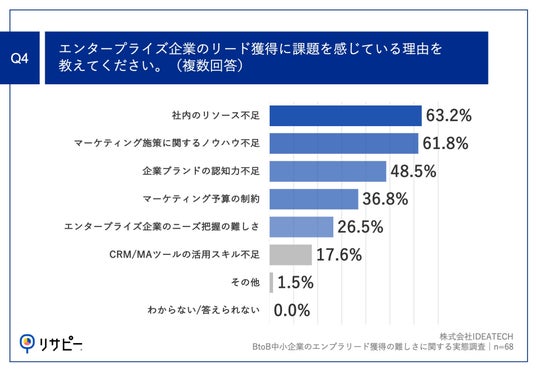 - エンタープライズ企業のリード獲得の課題、「社内のリソース不足」(63.2%)や「マーケティング施策に関するノウハウ不足」(61.8%)が上位に