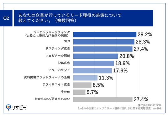 「Q2.あなたの企業が行っているリード獲得の施策について教えてください。(複数回答)」(n=106)と質問したところ、「コンテンツマーケティング(お役立ち資料/WP発信や活用)」が29.2%、「SEO」が28.3%、「リスティング広告」が27.4%という回答となりました。