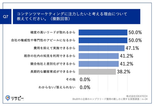 Q6で「コンテンツマーケティング(お役立ち資料/WP発信や活用)」と回答した方に、「Q7.コンテンツマーケティングに注力したいと考える理由について教えてください。(複数回答)」(n=34)と質問したところ、「確度の高いリードが取れるから」が50.0%、「自社の権威性や専門性のアピールになるから」が50.0%、「費用を抑えて実施できるから」が47.1%という回答となりました。