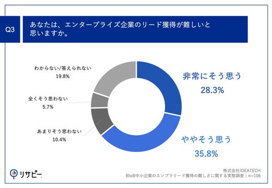 「Q3.あなたは、エンタープライズ企業のリード獲得が難しいと思いますか。」(n=106)と質問したところ、「非常にそう思う」が28.3%、「ややそう思う」が35.8%という回答となりました。