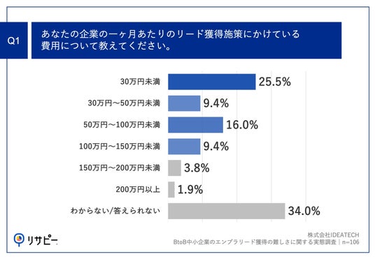 「Q1.あなたの企業の一ヶ月あたりのリード獲得施策にかけている費用について教えてください。」(n=106)と質問したところ、「30万円未満」が25.5%、「50万円~100万円未満」が16.0%という回答となりました。