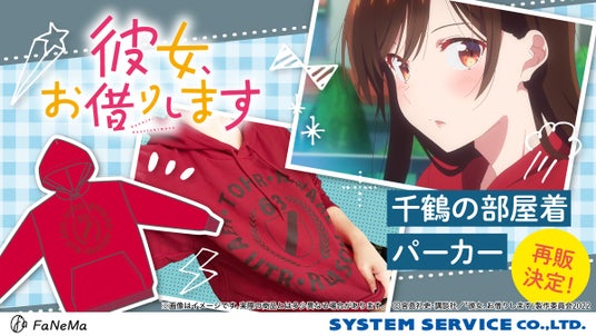 システムサービス株式会社(本社:東京都豊島区、代表取締役社長:田村宗弘)は、アニメ・マンガ・ゲーム作品等のキャラクター商品の企画・製作・販売をする自社ECサイト「FaNeMa」(URL:https://fanema.jp/)にて、TVアニメ『彼女、お借りします』より「千鶴の部屋着パーカー」を再受注販売をいたします。