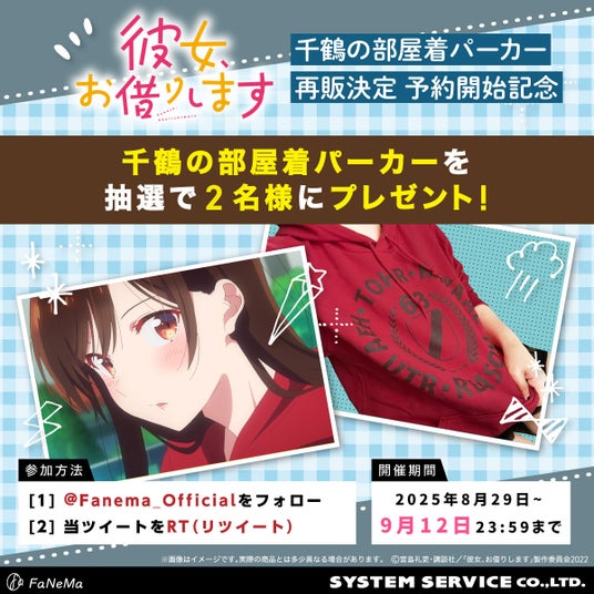 『彼女、お借りします』「千鶴の部屋着パーカー」の再受注を記念して、X(旧Twitter)フォロー&リポスト(RT)キャンペーンを実施いたします。