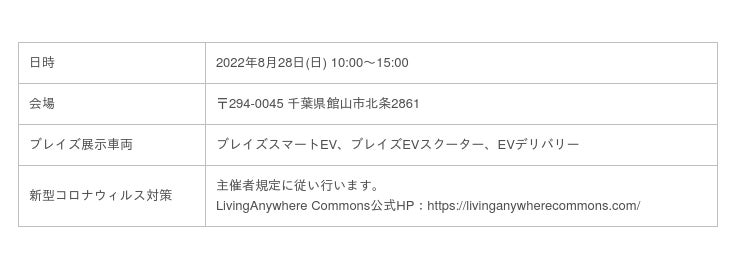 株式会社ブレイズ(愛知県名古屋市、代表取締役:市川秀幸、以下ブレイズ)は、2022年8月28日(日)に千葉県館山市で開催される「LivingAnywhere Commons館山 EVモビリティ体験試乗会」に出展いたします。
