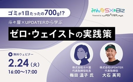 本ウェビナーでは、日本初のゼロ・ウェイスト・スーパーマーケットを展開する株式会社斗々屋 代表・梅田温子氏を迎え、日々の業務の中で「ゴミを出さない」仕組みや考え方、具体的な実践例をご紹介します。あわせて、株式会社UPDATERから、「オフィス斗々屋」を導入した実例をもとに、オフィスにおけるゴミ削減の効果や、実践のポイントを解説します。