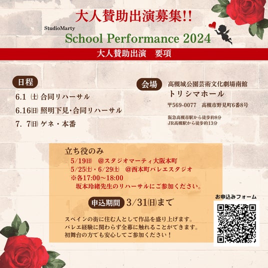 本作品の舞台である、スペイン・バルセロナに住む街人として出演し、踊りだけでなく演技も学ぶことができ、大満足の舞台となるでしょう。