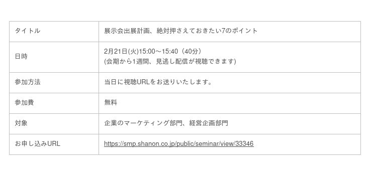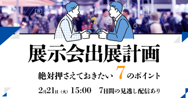 株式会社シャノン(本社:東京都港区、代表取締役社長:中村 健一郎)は、展示会出展計画に欠かせない7個のポイントをご紹介するウェビナーを2月21日(火)に開催します。