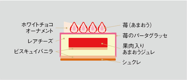 あまおうをしきつめた贅沢な一品です。苺のパータグラッセに閉じ込められた果肉入りあまおうジュレとレアチーズの爽やかなハーモニーをお楽しみください。