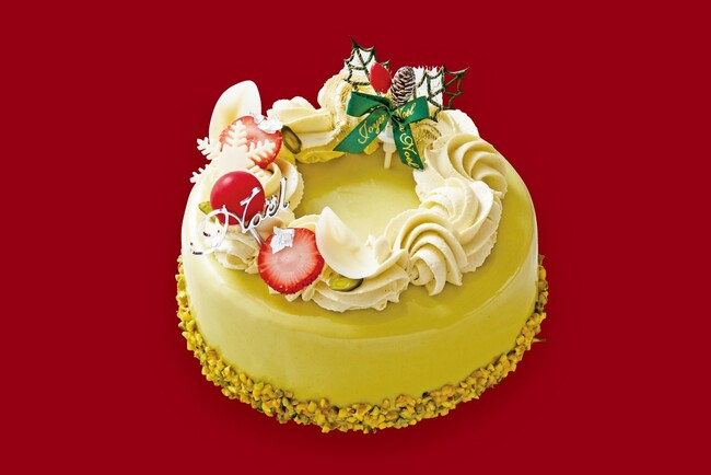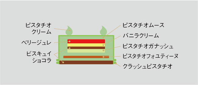 ピスタチオクリームやピスタチオムース、ピスタチオガナッシュなどが何層にも重なった、ピスタチオの豊潤な味わいをお楽しみいただける一品。ベリージュレとバニラクリームがアクセントになった上品な味わいです。