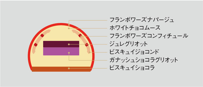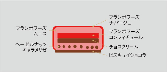 フランボワーズムースとフランボワーズコンフィチュールに、チョコクリームがマッチする甘酸っぱさと、インパクトある見た目がクリスマス気分を盛り上げます。