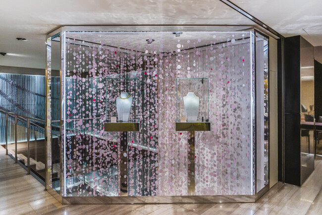 さくら色に染まった銀座本店で、TASAKIならではのモダンで革新的なジュエリーの世界をお楽しみください。