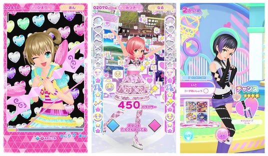 4月3日(木)から稼動する『アイプリバース リング1だん』では、「アイプリひろば」に『プリティーリズム・レインボーライブ』の主人公チーム「ハッピーレイン♪」の3人( 「彩瀬なる」「涼野いと」「福原あん」 )が登場します。『プリティーリズム・レインボーライブ』は、2013年4月から1年間テレビアニメとアミューズメントゲームが展開されていた作品で、今回登場する3人のキャラクターは当時のゲームCGと同じ姿となっています。当時のビジュアルそのままに、自分の「マイキャラ」と一緒に「ミニライブ」をしたり「パシャリング」で写真撮影をしたりといったゲームを楽しむことができます。