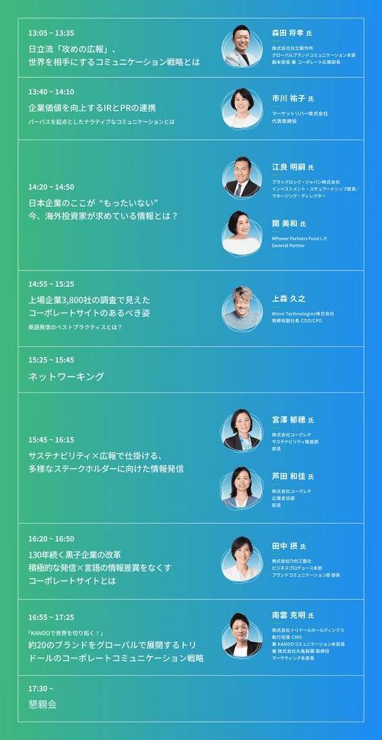 また他講演では、サステナビリティ情報の発信、積極的なコーポレート広報、ブランドコミュニケーション、などをテーマに、コーポレートコミュニケーションのあり方について学びを深めるとともに、WOVN からは“コーポレートサイト英語対応のベストプラクティス”をご紹介します。