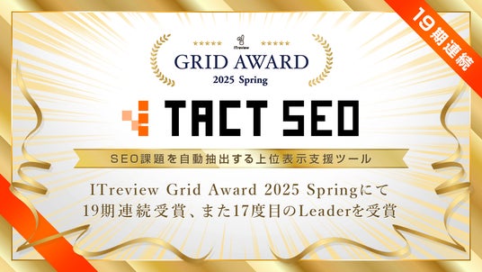 株式会社ウィルゲート(本社:東京都港区、代表取締役:小島 梨揮、以下「ウィルゲート」)が提供するAI×SEOツール「TACT SEO」は、アイティクラウド株式会社(本社:東京都港区、代表取締役社長 兼 CEO:黒野 源太)が主催する「ITreview Grid Award 2025 Spring」の「SEOツール」部門において、認知度とユーザー満足度が優れているサービスに贈られる「Leader」を受賞したことをお知らせいたします。今回でSEOツール部門は19期連続受賞、「Leader」の受賞は17度目(※1)となります。