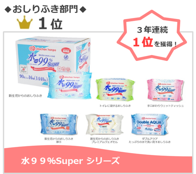 おしりふき部門 第1位「水99%Super シリーズ」、ベビー肌着部門 第3位「アカチャンホンポオリジナル ベビー肌着」が受賞しました。「水99%Super シリーズ」は、おしりふき部門において3年連続1位を獲得し、「水分量とコスパの良さ」で数多くの評価をいただきました。