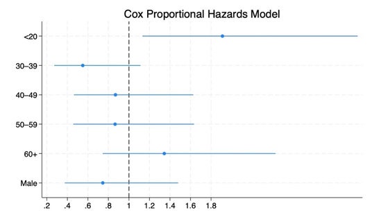 ・多変量Cox解析では、20歳未満群においてハザード比1.91(95%CI: 1.13-3.23)と有意な増加を示した。60歳以上群ではハザード比1.34と上昇傾向を示したが、有意差は認められなかった(p=0.327)。