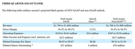 以下の表は、オンセミの2024年第3四半期のGAAPおよび非GAAPベースの見通し概要です。
