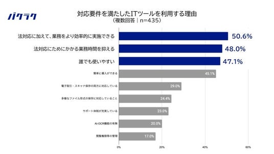次に、「対応要件を満たしたITツールを利用する」と回答した理由を質問したところ、「法対応に加えて、業務をより効率的に実施できる」が最多回答(50.6%)となりました。次いで「法対応のためにかかる業務時間を抑える」が48.0%、「誰でも使いやすい」が47.1%となりました。