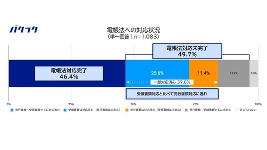 電帳法への対応状況(「電子取引」区分に該当する書類への対応)を質問したところ、37.0%が「一部対応済み」、12.7%が「未対応」と回答し、対応が未完了の企業は合わせて49.7%となりました。一方、「発行書類・受領書類ともに対応済み」と回答し、電帳法への対応が完了している企業は46.4%となりました。