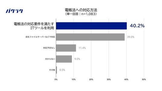 電帳法への対応方法について質問したところ、「電帳法の対応要件を満たすITツールを利用」が40.2%で最多となりました。