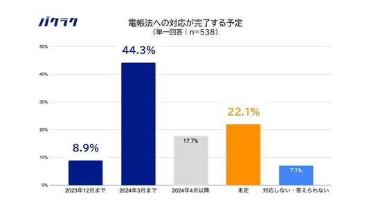 対応が未完了の企業(「受領書類は対応済み 」・「発行書類は対応済み」のいずれか)と未対応の企業の担当者に対し、電帳法への対応が完了する予定時期を質問したところ、宥恕期間が終了する「2023年12月までに対応」予定の企業は8.9%となりました。また、「2024年3月までに対応」予定の企業は44.3%となりました。一方、22.1%の企業が対応完了の予定時期が未定であることがわかりました。