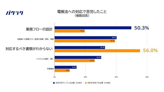 - 電帳法への対応で苦労したこと、対応が完了している企業の最多回答は「業務フローの設計」。対応が未完了の企業では「電帳法に対応するべき書類が分からない」が最多