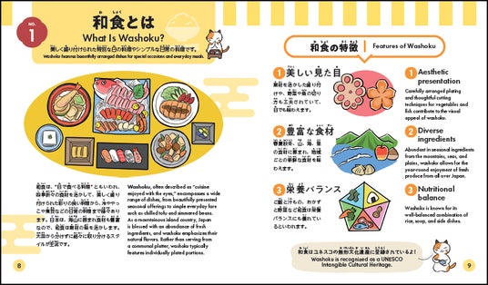 本書は小学校中学年以上を対象に和食について紹介した書籍です。小学校でも英語の授業が始まり、教室でもグローバル化が進む中、日本の文化について外国の方と話したり紹介したりする機会も増えています。そこで本書では、日本の文化の1つとして近年注目される「和食」について、日本語と英語の二言語で紹介。日本語と英語ともに平易な表現、ふりがな付きであり、留学生や日本語・英語を学び始めた方などにもお読みいただけます。