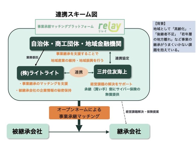 事業承継マッチングプラットフォーム「relay(リレイ)」を運営する株式会社ライトライト(宮崎県宮崎市 / 代表取締役:齋藤隆太)は、このたび三井住友海上火災保険株式会社と業務提携したことをお知らせいたします。
