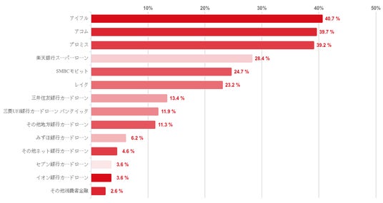 消費者金融カードローンのアイフルが40.7%で最も多く、アコム、プロミスなどがこれに続いた。
