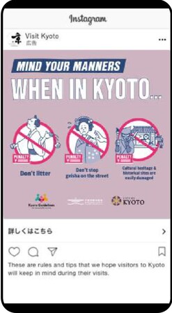 JNTO海外事務所を通じて、現地旅行会社に対し、観光マナーの理解・遵守や、同社の顧客(旅行者)に京都観光におけるマナー等を周知いただくよう要請しました。(本年9月に実施済み)