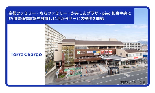 電気自動車(EV)向け充電サービス「Terra Charge(テラチャージ)」を展開するTerra Charge 株式会社(本社:東京都港区、代表取締役社長:徳重徹、以下「当社」)は、京都ファミリー(京都府京都市右京区山ノ内池尻町1-1)、ならファミリー(奈良県奈良市西大寺東町2丁目4-1)、かみしんプラザ(大阪府大阪市東淀川区大隅1丁目6-12)、pivo 和泉中央(大阪府和泉市いぶき野5丁目1-2)へ6kW出力の普通充電器を計61口設置し、2024年11月から順次サービス提供を開始いたしました。