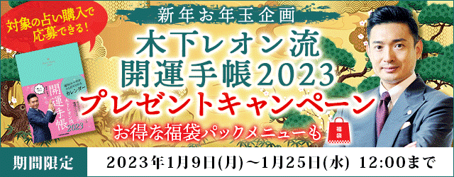フジテレビ系列で放送中の占い番組『突然ですが占ってもいいですか?』で人気を博している木下レオン。ただいま、月額公式サイト『木下レオン◆帝王数』にて、「2023年の開運手帳プレゼントキャンペーン」を開催中です。期間中、キャンペーン対象の占いメニューの鑑定ページよりご応募いただいた方から抽選で3名様に木下レオンの『木下レオン流 開運手帳2023』(KADOKAWA)をプレゼントいたします。ご応募お待ちしております。
