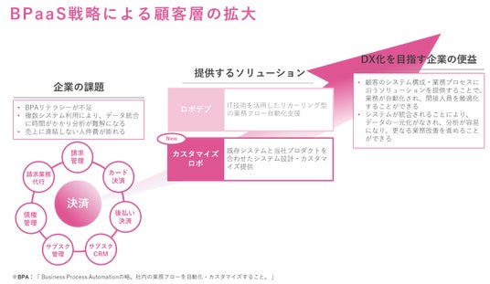 株式会社ROBOT PAYMENT(本社:東京都渋谷区、代表取締役:清久 健也、以下 当社)は、BPA(※1)を支援するBPaaS(※2)事業の「ロボデブ」につづき、第二弾としてシステム設計・カスタマイズ提供サービス「カスタマイズロボ」の提供を開始することをお知らせします。企業ごとの業務プロセスに合わせてシステム設計・構築をすることで、これまでのフローを変更することなく自動化を実現します。