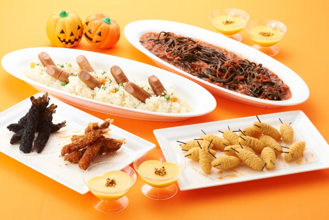また、ブッフェ台には「イモムシみたいなポテト」「血まみれソースの黒パスタ」「指をちりばめたピラフ」など、親子でハロウィーン気分を楽しめるハロウィーン料理コーナーも登場します。