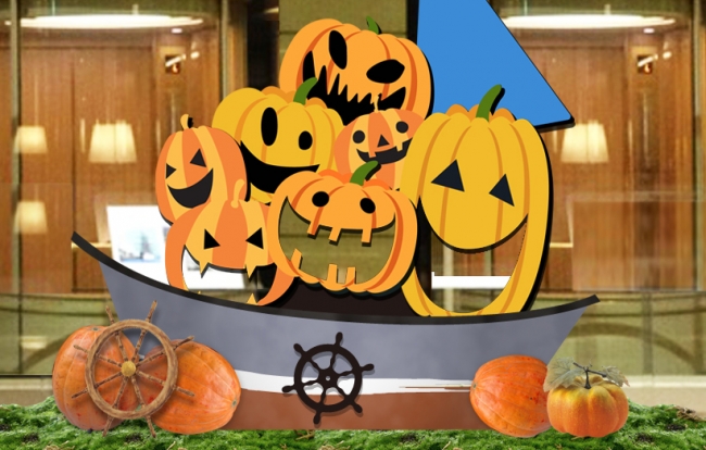 ロビーのステージ上に仮装でお楽しみいただける撮影スポットが登場いたします。海のそばに立つホテルにふさわしく、愛らしい表情のカボチャのおばけ達が船に乗ってロビーに出現した様子を表現したパネルを置き、魔女の帽子や魔法のマントなど仮装グッズも設置いたします。どなたでも気軽にハロウィーン気分で記念撮影がお楽しみいただけます。