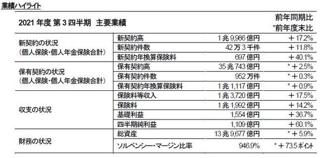 メットライフ生命保険株式会社(代表執行役 会長 社長 最高経営責任者 ディルク・オステイン)の2021年度第3四半期(2021年4月1日~2021年12月31日)の業績をお知らせします。