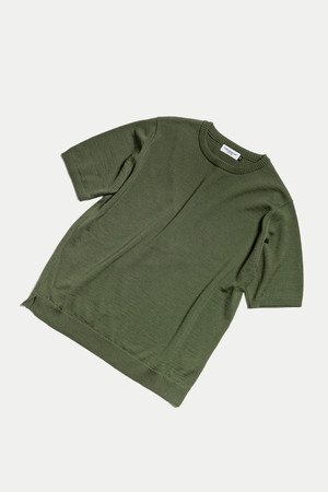 1枚でも様になり、休日のお出かけやテレワーク時のテレビ会議など幅広いシーンにマッチするニットTシャツ。ネックの詰まり具合、丈やリブの長さなどを細かく調整することでドレッシーに見えるバランスが追求されています。裾にはスリットを入れることで、ジャケットのインナーとしてタックアウトで着用しても、ウエストまわりに裾が溜まりにくいように設計。Tシャツのようにリラックスした着用感ながら、ネックまわりのリブ、肩周りに施された「減らし目」と呼ばれる仕様など、細かなディテールでニットならではの表現をしたデザインが特徴です。