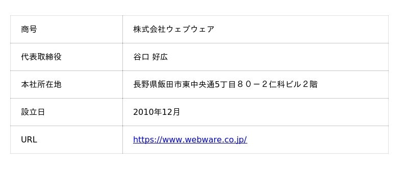 ミライドア株式会社(本社:東京都港区、代表取締役会長兼社長:澤田 大輔、以下「ミライドア」)は、長野県・株式会社日本政策金融公庫(以下「日本政策金融公庫」)と連携し、県内金融機関等と共同で設立した「信州スタートアップ・承継支援2号投資事業有限責任組合」(以下「信州SS2号ファンド」)より、株式会社ウェブウェア(本社:長野県飯田市、代表取締役:谷口 好広、以下「ウェブウェア」)に投資を実行しましたことをお知らせいたします。