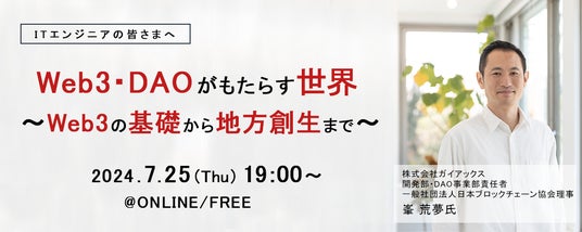 ITエンジニアの新しい働き方を提案する株式会社PE-BANK(東京都港区/代表取締役 高田 幹也)は、2024年7月25日(木)19時より、ITフリーランスのためのオンラインセミナー、 『 Web3・DAOがもたらす世界~Web3の基礎から地方創生まで~』』を開催いたします。本ウェビナーはITフリーランス向け福利厚生サービス「サポートプラス」が主催するウェビナーで、今回で第53回目の開催となります。
