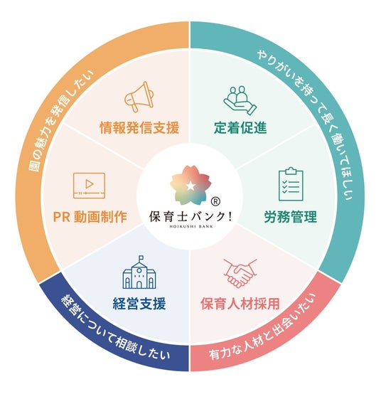 採用支援、業務改善、職員の定着支援、集客活動の強化、そして経営支援など保育業界が抱える課題を解決するための包括的なプラットフォームです。