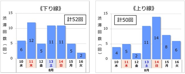 〇NEXCO西日本管内の渋滞回数は、下り線では8月11日(木曜・祝日)、上り線では8月13日(土曜)~8月1