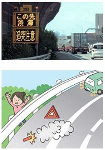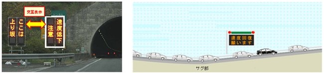 (上り坂などの渋滞発生箇所付近において、LED標識で「速度低下注意」や「速度回復願います」を表示)