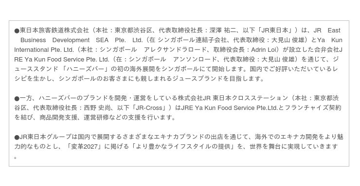 (JR East Business Development SEA Pte. Ltd.とYa Kun International Pte. Ltd.)の合弁会社」)